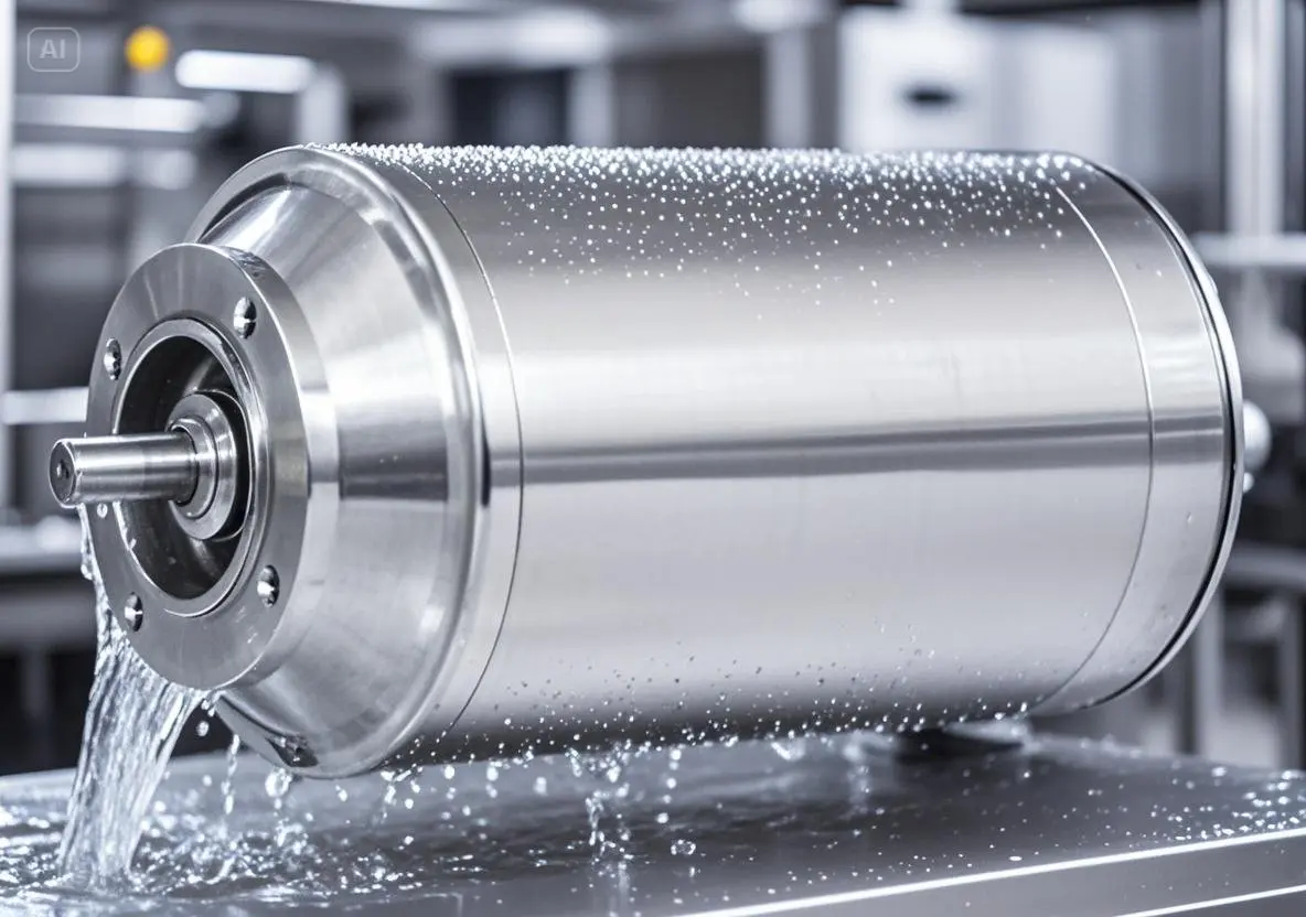 Dettaglio di un motore elettrico in acciaio inox lucido, con gocce d'acqua sulla superficie liscia, in un ambiente sterile.